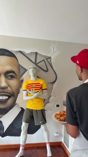 在视频的最后,镜头赚到房间的一面墙,那里摆着一个亚马尔标志性庆祝动作的模型,亚马尔的父亲拿着鸡块说:“嘿,拉明,你还好吗?我特别爱你,孩子,爸爸爱你。我给你准备了惊喜,小可爱。等会儿给你戴上,咱就给大伙儿瞧瞧。我爱你。”