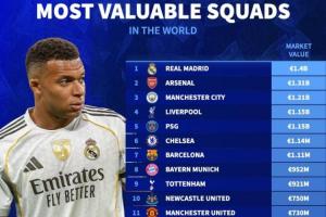 全球俱乐部身价榜:皇马14亿居首,枪手曼城分列2-3,共7队超10亿